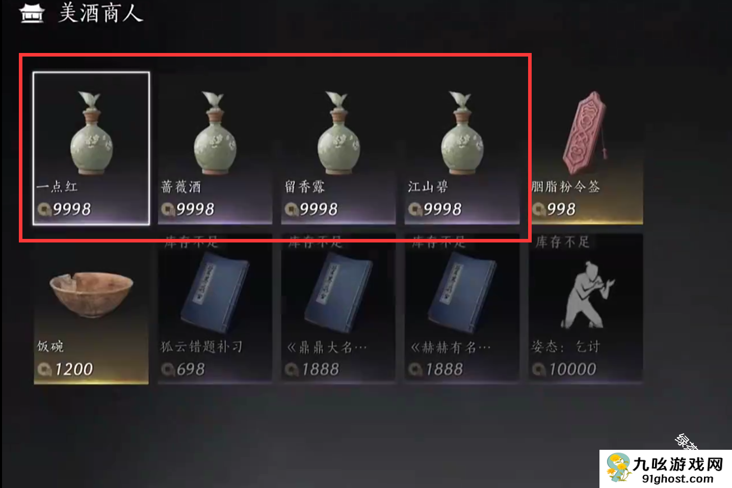 5、首先来到丰禾村找到真货商人郝久,在这里可以购买四种美酒:一点红、蔷薇酒、留香露、江山碧;