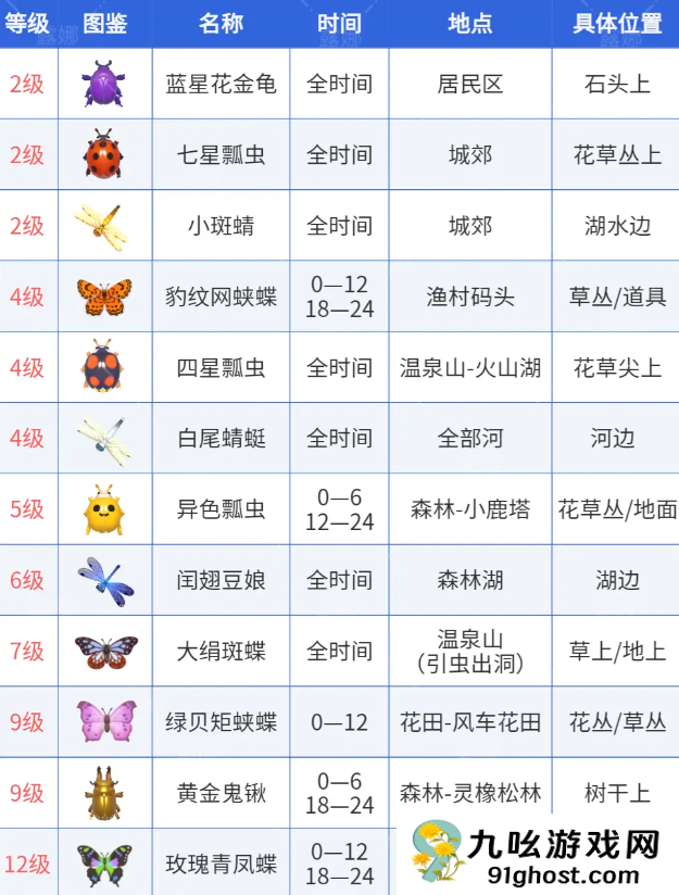 彩虹天比雨天珍贵,建议雨天先捕 蓝星花金龟、七星瓢虫、小斑蜻、豹纹网蛱蝶、四星瓢虫、白尾蜻蜓、异色瓢虫、闰翅豆娘、大绢斑蝶、绿贝矩蝶、黄金鬼锹、玫瑰青凤蝶