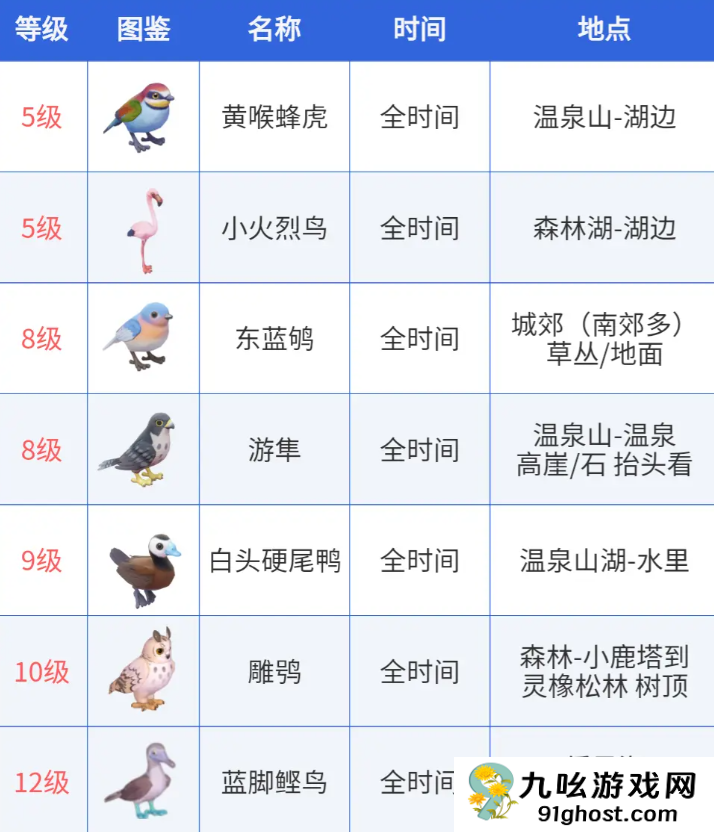 黄喉蜂虎、小火烈鸟、东蓝鸲、游隼、白头硬尾鸭、雕鸮、蓝脚鲣鸟只有雨天才可以观