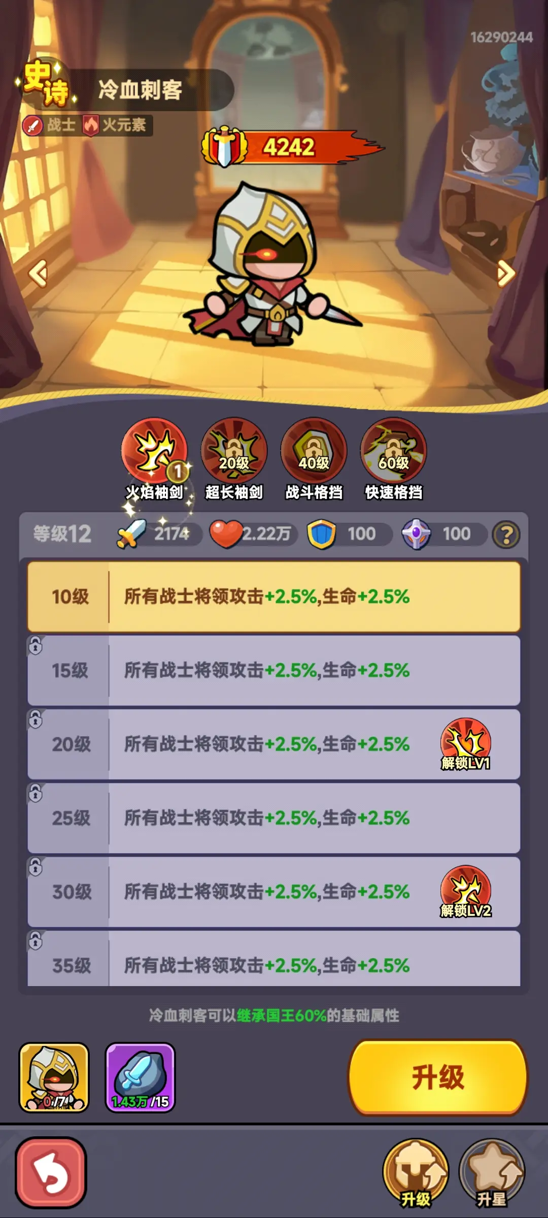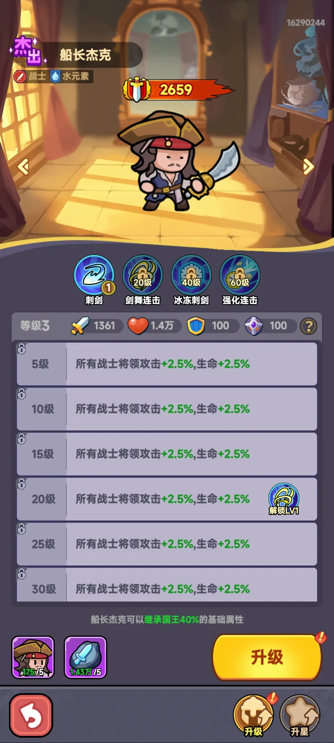 15关之后需要的英雄,船长的一二技能强度不高,第三个技能能让一技能觉醒,并且打出冰冻效果,让目标无法移动3秒,打BOSS有优势且关键,走点位能耗死,属杰出中品。