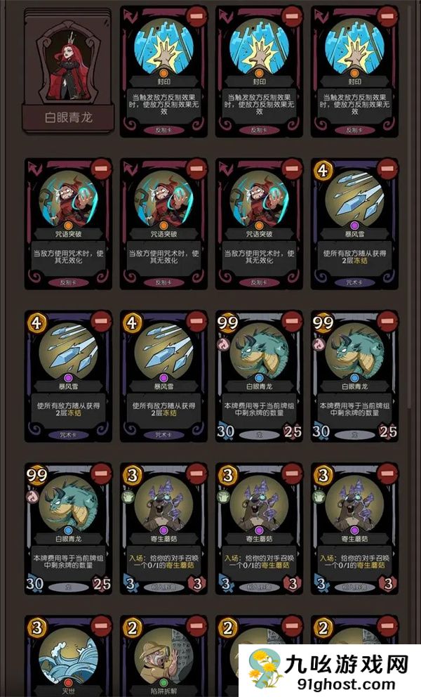 白眼青龙卡组的战斗流程起始于运用蘑菇锁和火焰漩涡封锁敌方场地,结合寒流与暴风雪冻结对手随从。随后,通过匹诺曹和咒术陷阱进行高效过牌,加速资源积累。最终阶段,释放灭世效果清理战场,并以白眼青龙完成终结一击。
