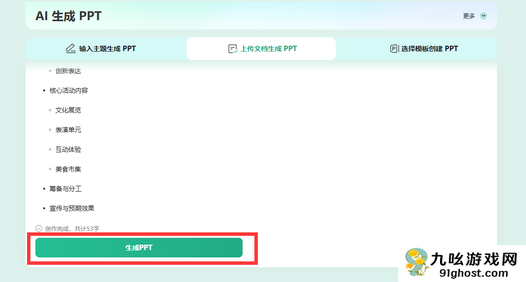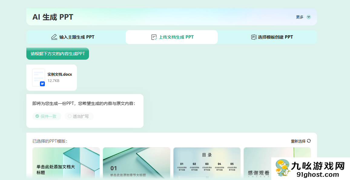 2、然后选择ppt的模板,点击下方的生成ppt就可以进行生成了;