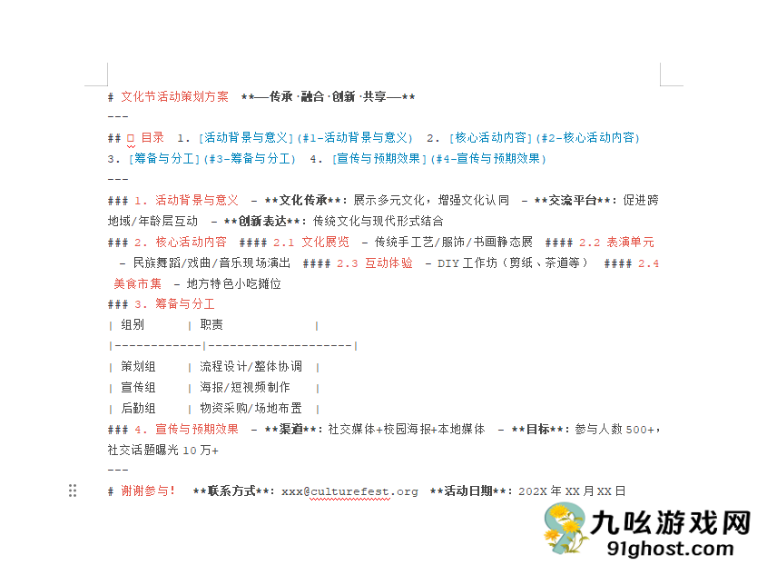 请用Markdown格式生成关于[文化节]的主题大纲,包含封面、目录、4个核心章节及结束页,语言简洁易懂,适合展示;