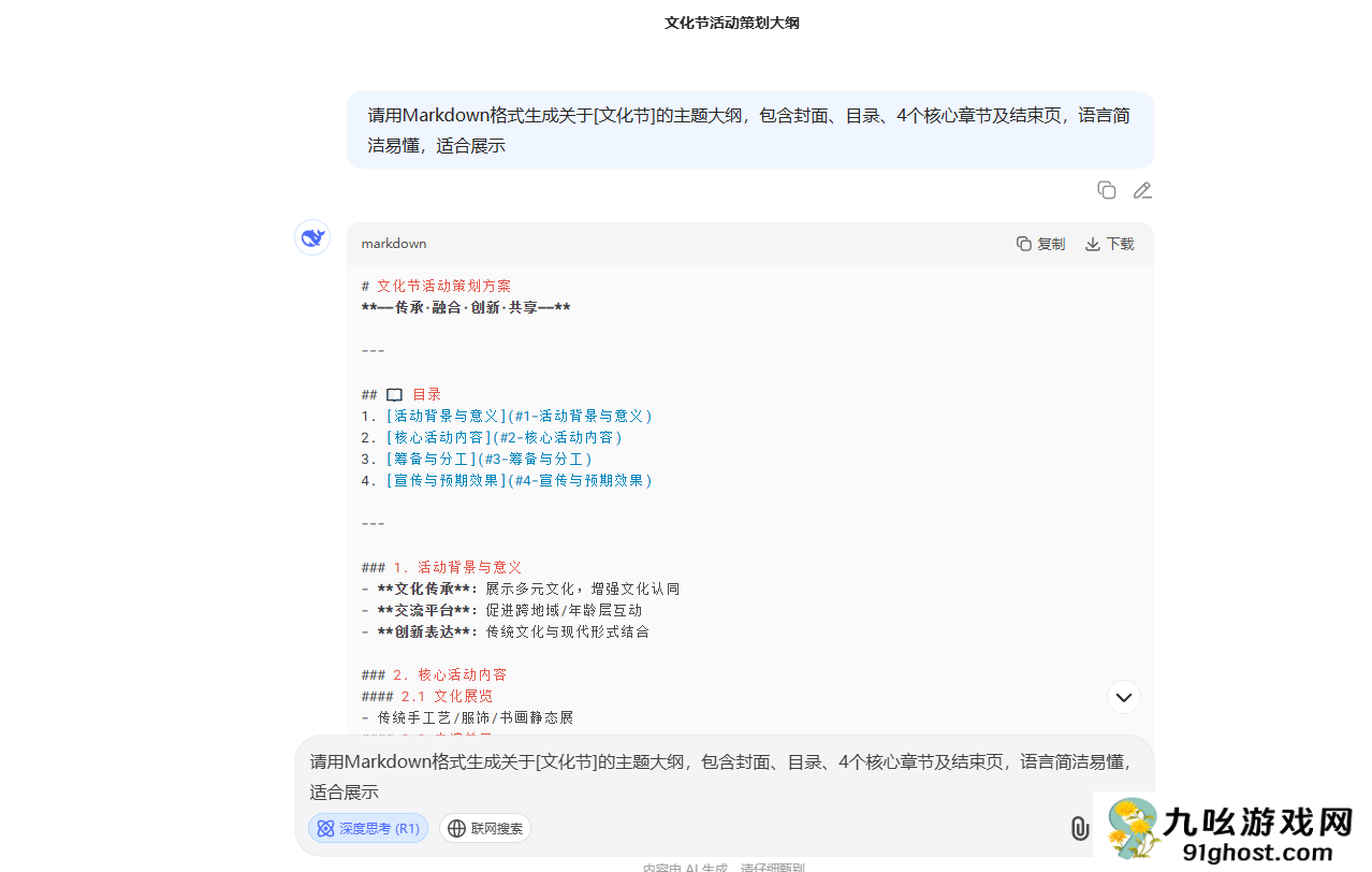 deepseek中首先可以输入指令内容让其制作出ppt中的主题大纲,并包含目录章节以及结束语等核心内容,然后将其生成的文本内容,导入至ppt转换中,最后就可以生成一个完整的ppt文档了,下面是完整的操作流程步骤教程。