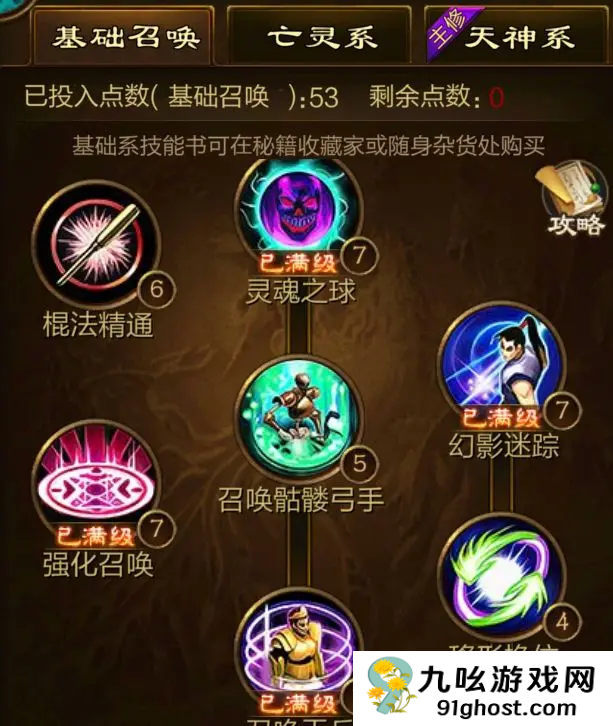 1、它的基础召唤就是我们最开始的技能的,然后是有三个系列可以选择的,第一个是基础召唤,这个技能就是一些常见的召唤了,可以召唤土灵和骷髅弓箭手和天兵这三个,其他的就是一些棍发的加强伤害和一些特殊的技能。