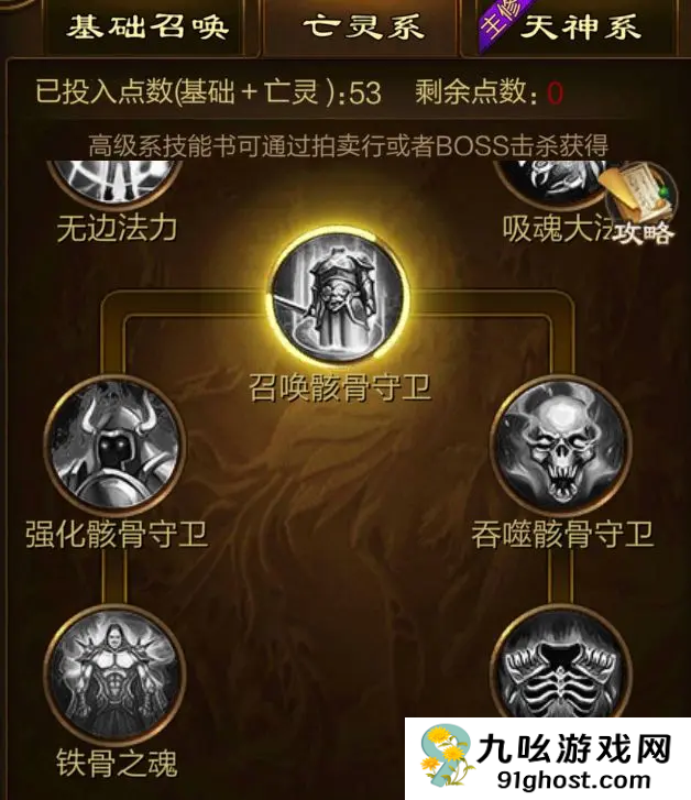 2、第一个亡灵系的技能,这个里面的技能就是属于召唤亡灵的一些技能了,就不会在召唤天兵和土灵那些了,就只会召唤骷髅大军和亡灵大军这些召唤目标了,其他的就是一些强化这些召唤的技能和一些加成属性技能了。