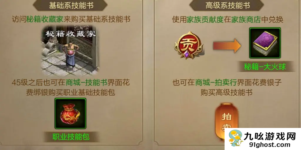 5、基础系的技能可以直接访问秘籍收藏家来获得的,如果你满了15级之后就可以直接在商城里面购买了,高级系列的技能书就只能在家族里面用贡献度在家族商店里面兑换的,也可以在商城里面的拍卖行里面用银子购买高级技能书的。
