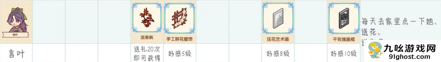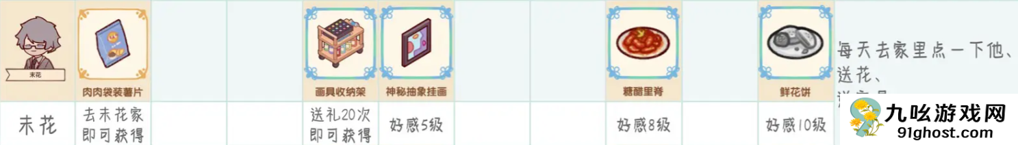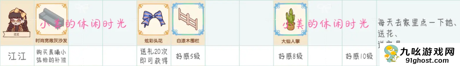我的休闲时光NPC送礼每种植物和家具只能送一次,且达到一定的好感度时还可以收到NPC的回礼,回礼是独一无二无法通过其他途径获得的。下面列举了具体的游戏中NPC喜爱的礼物内容详情!