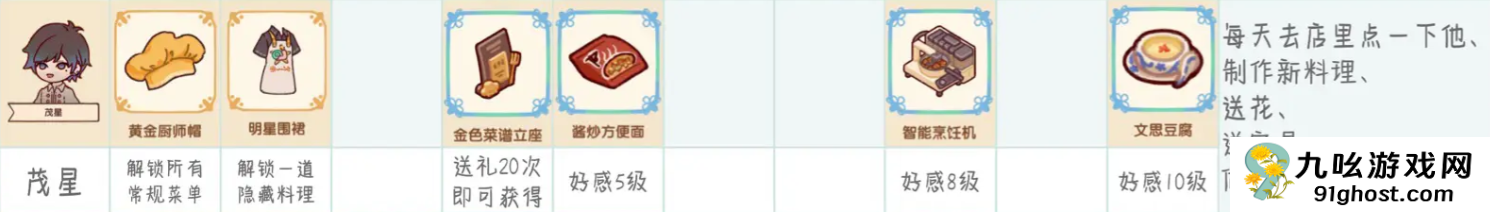 5、茂星:黄金厨师帽、明星围裙、金色菜谱力座、酱炒方便面、智能烹饪机、文思豆腐;