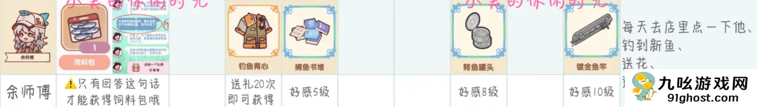 7、余师傅:钓鱼背心、捕鱼书堆、鲱鱼罐头、镀金鱼竿;
