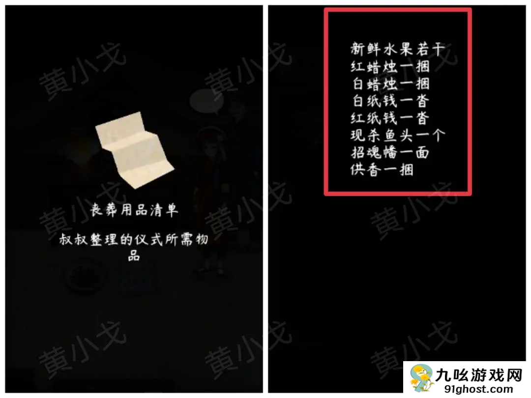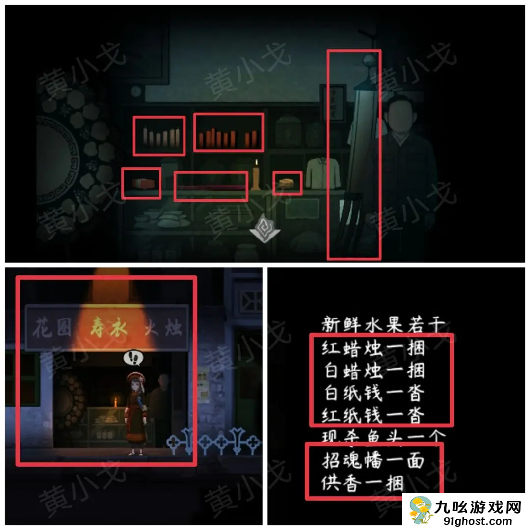 4、进入丧葬用品店,根据【丧葬用品清单】上的线索,选择需要的物品:【招魂幡】、【红纸钱】、【白蜡烛】、【供香】、【白纸钱】和【红蜡烛】
