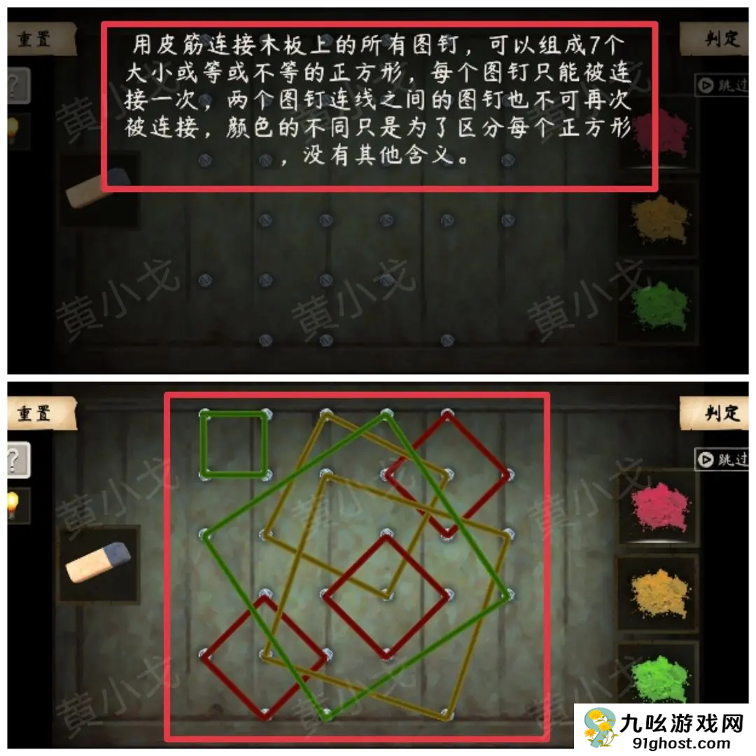 用皮筋连接木板上的所有图钉,可以组成7个大小或等或不等的正方形,每个图钉只能被连接一次,两个图钉之间的图钉也不可再次被连接,颜色的不同只是为了区分每个正方形,没有其他含义。