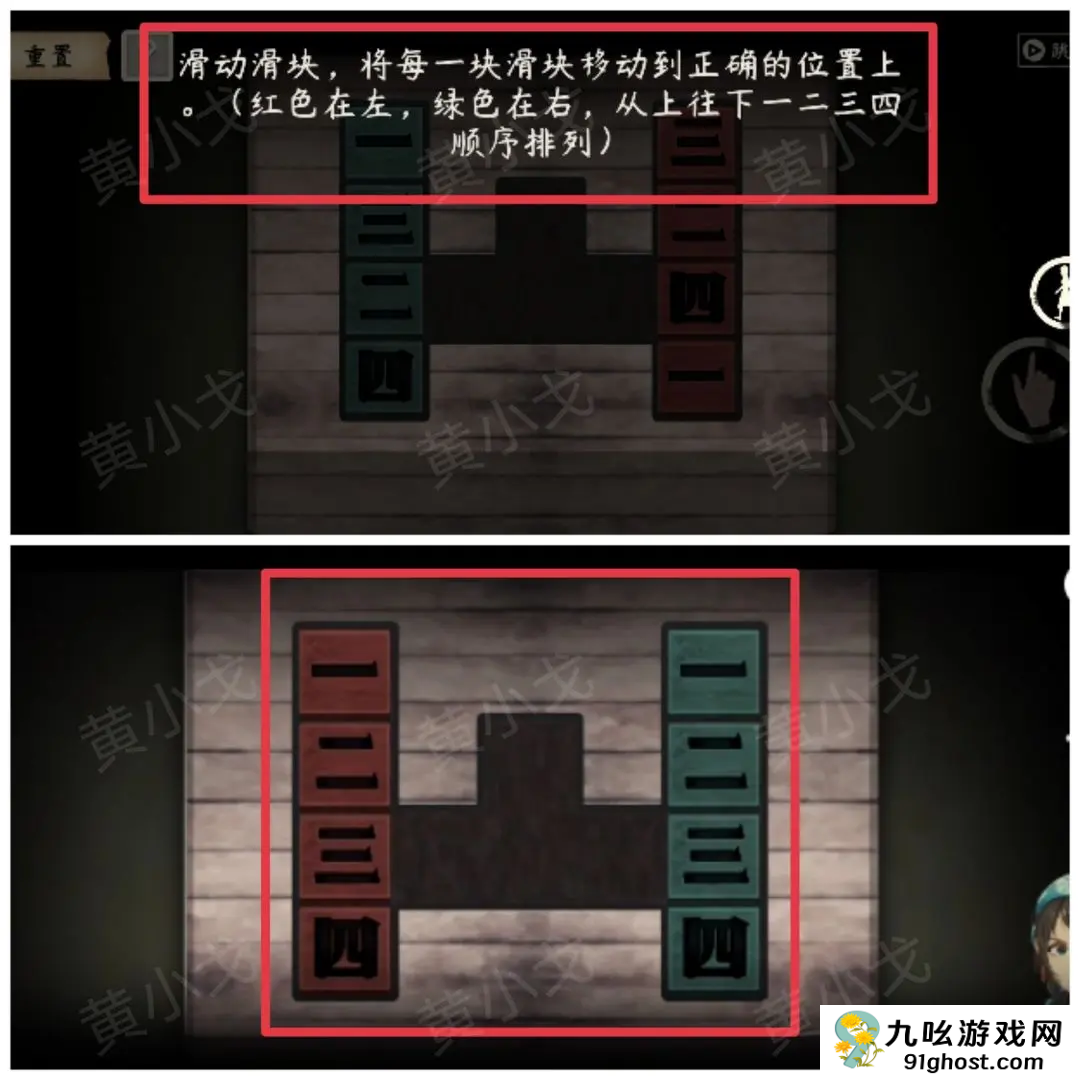 滑动滑块,将每一块滑块移动到正确的位置上。(红色在左,绿色在右,从上往下一二三四顺序排列)