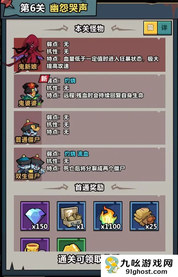 第六关敌方特性解密• 双生僵尸:畏惧灼烧与流血,无防御抗性• 鬼婆婆:灼烧可致重伤,残血时自我疗愈• 鬼新娘:无属性弱点,濒死时狂暴加速• 普通僵尸:无特殊抗性,基础炮灰单位