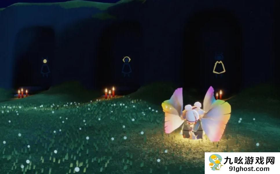 雨林地图的荧光森林区域(玩家俗称光菇图)设有一处经典留言石碑。从入口向前飞行,可看到一座避雨亭,亭内设有留言板和石碑。当系统发布冥想任务时,此处会出现白色光圈,玩家需在此完成打坐并发布留言。该位置也是雨林二图的核心地标之一,周围分布着大量发光蘑菇和烛光收集点。