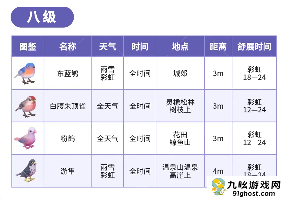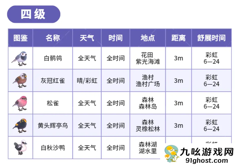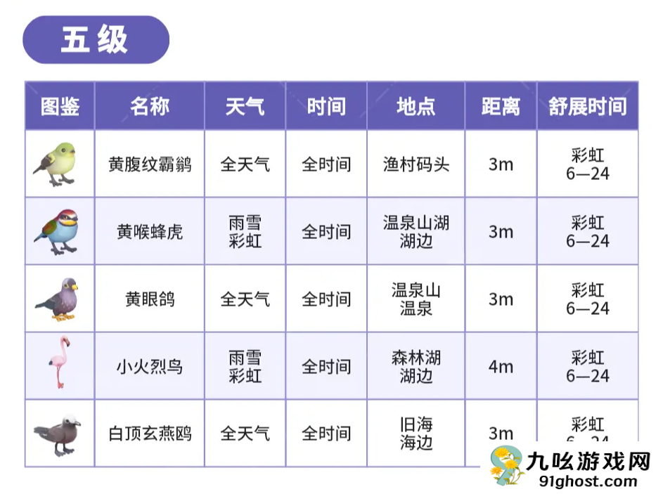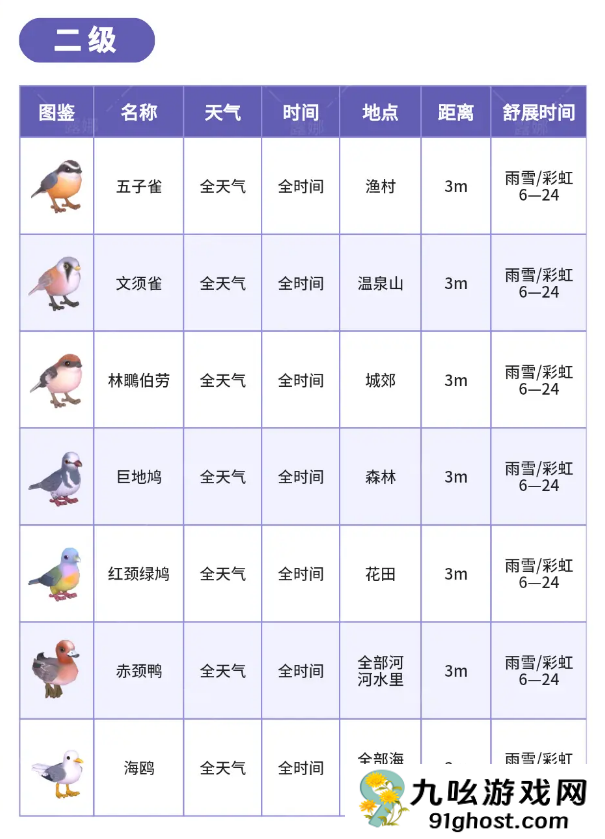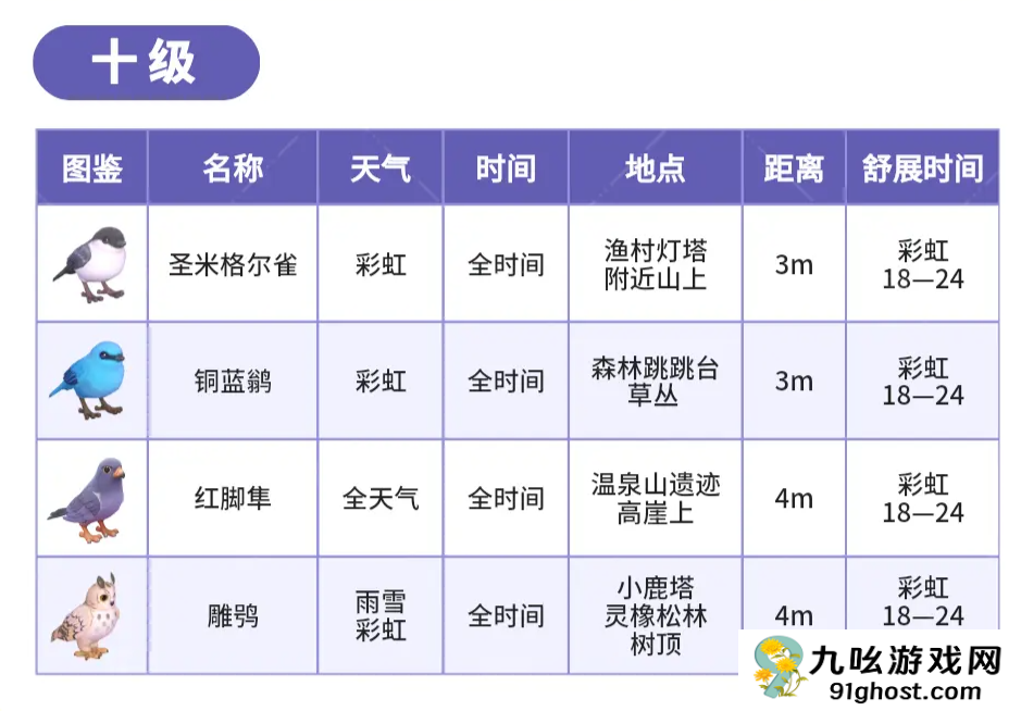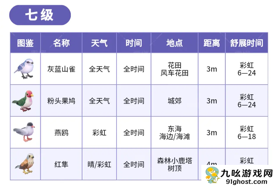 五子雀、林伯劳等仅限彩虹天或微风天气出现,需前往花田、橡木树林等特定地点。