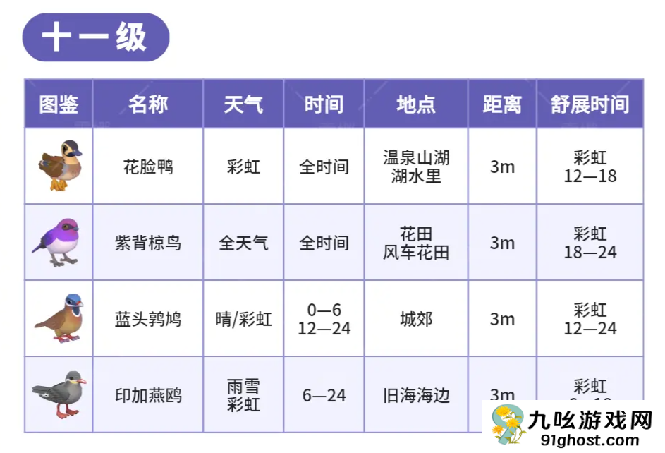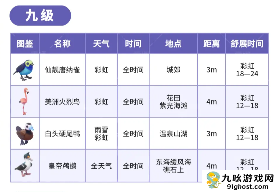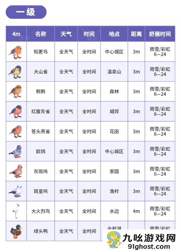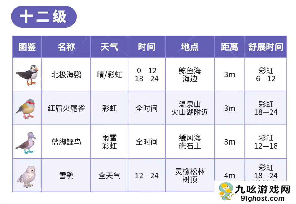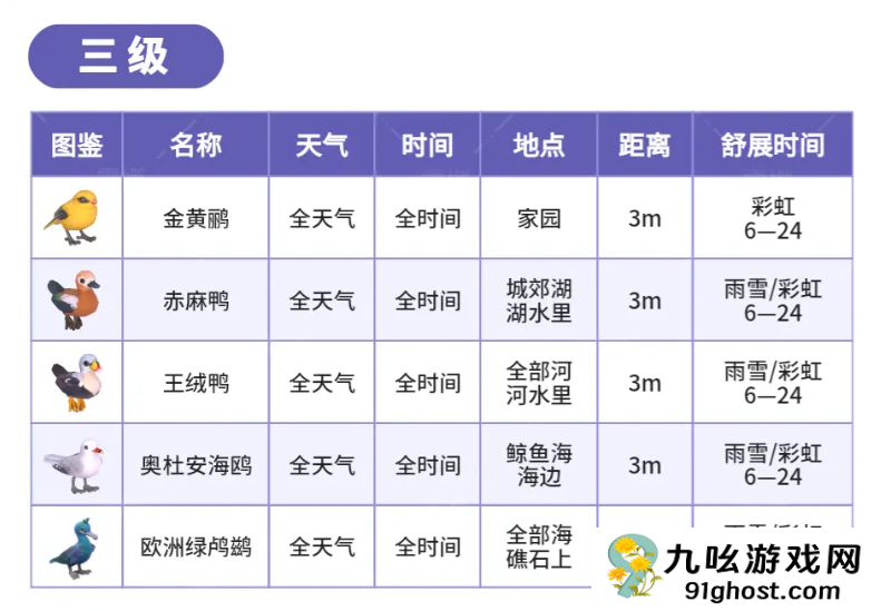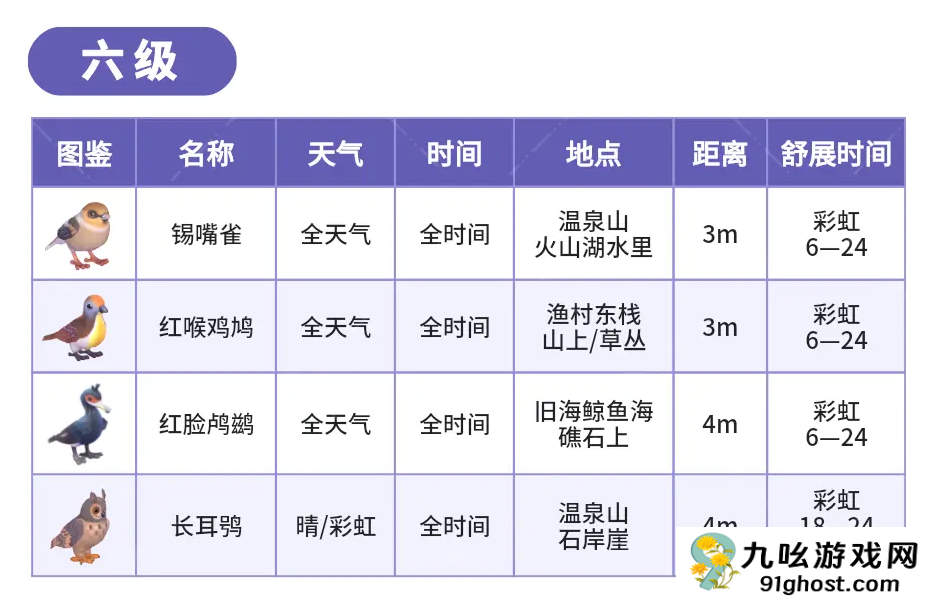 五子雀、林伯劳等仅限彩虹天或微风天气出现,需前往花田、橡木树林等特定地点。