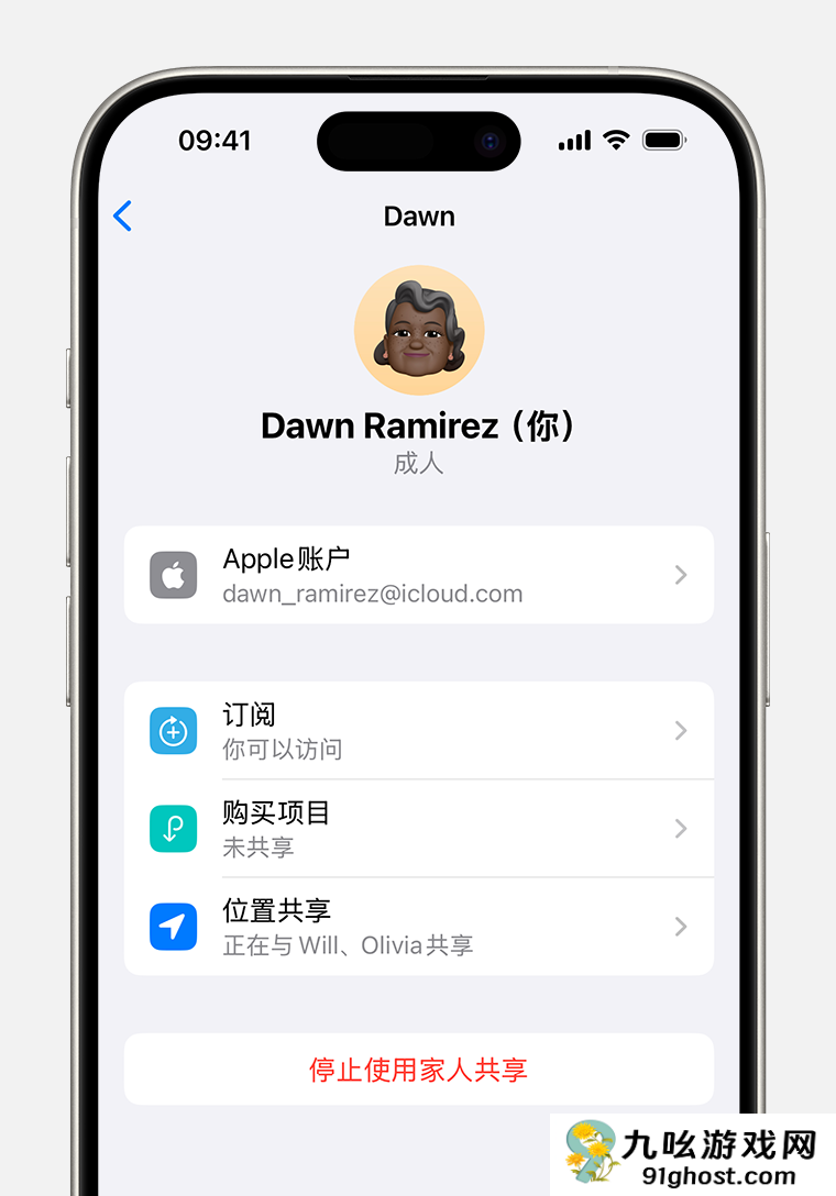 ② 点击你的姓名后,点击【停止使用家人共享】即可;