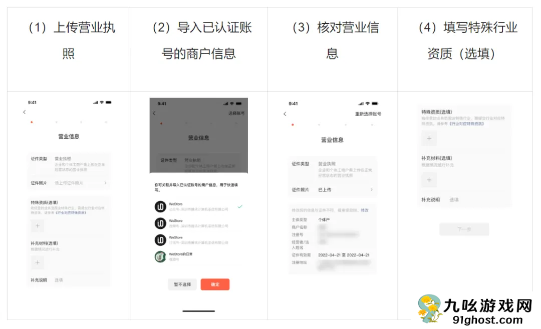 (3)系统会根据上传的营业执照或选择的商户账号自动获取营业信息,请仔细核对,确保填写的营业信息与营业执照一致。