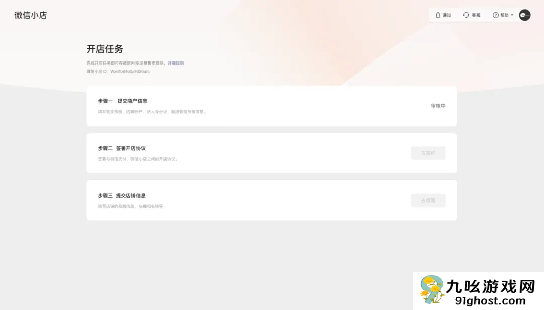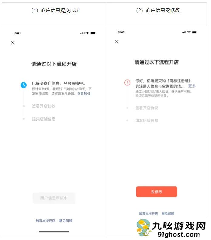 (1) 提交商户信息成功后,开店任务页面会显示「审核中」。
