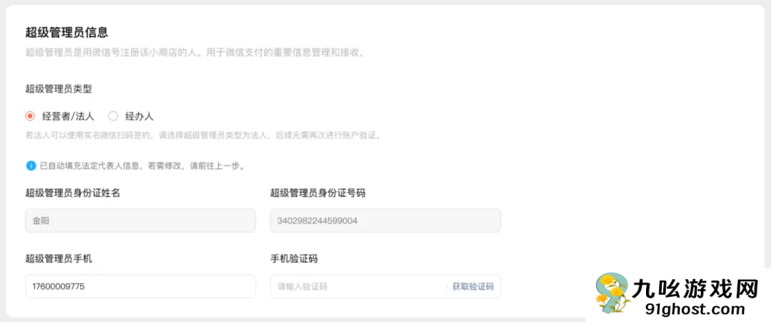 超级管理员可以为经营者/法定代表人,或其他经办人。绑定超级管理员时,需要填写其身份证、手机和邮箱信息。