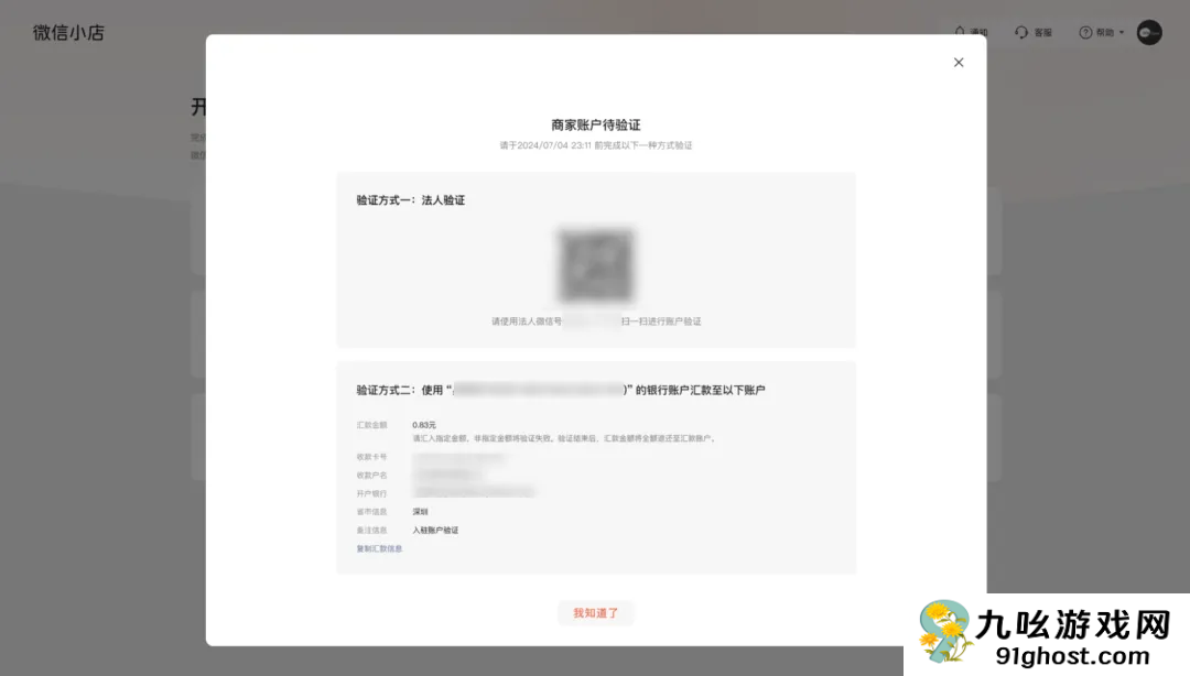(2)验证的方式包括:公司法定代表人微信扫码验证或公司公户汇款两种方式,请选择其中一种方式进行验证账户。