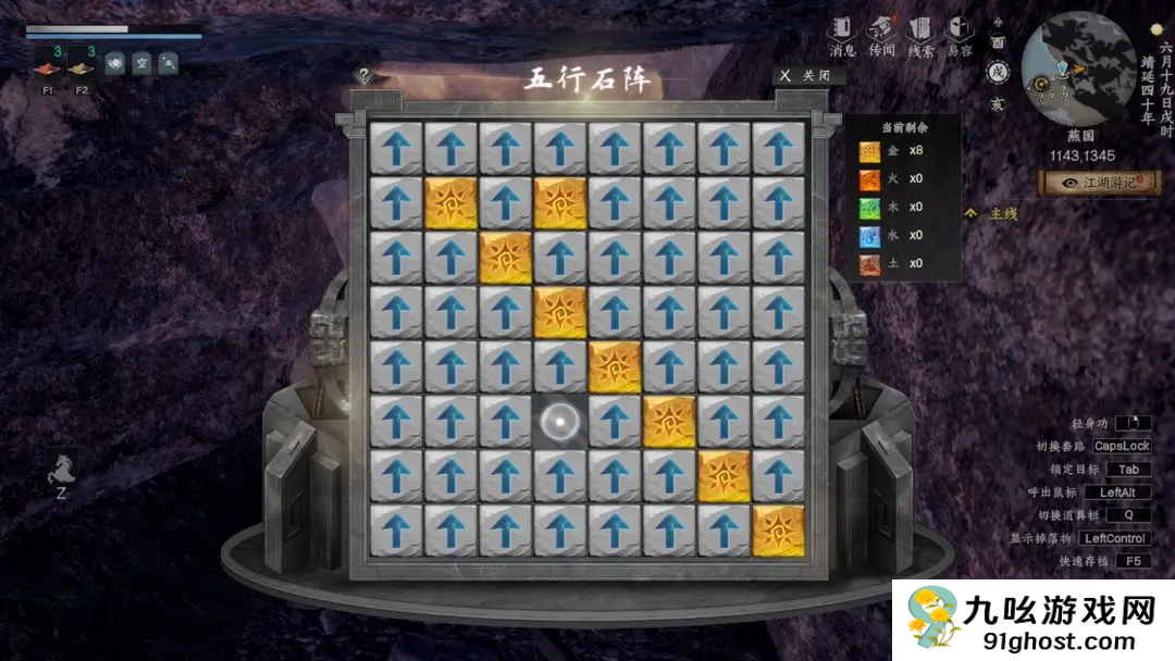 2、移动光点到对应上下左右方向将两个或以上元素石碑聚集在一起消除,直到不留一个元素石碑即可破解