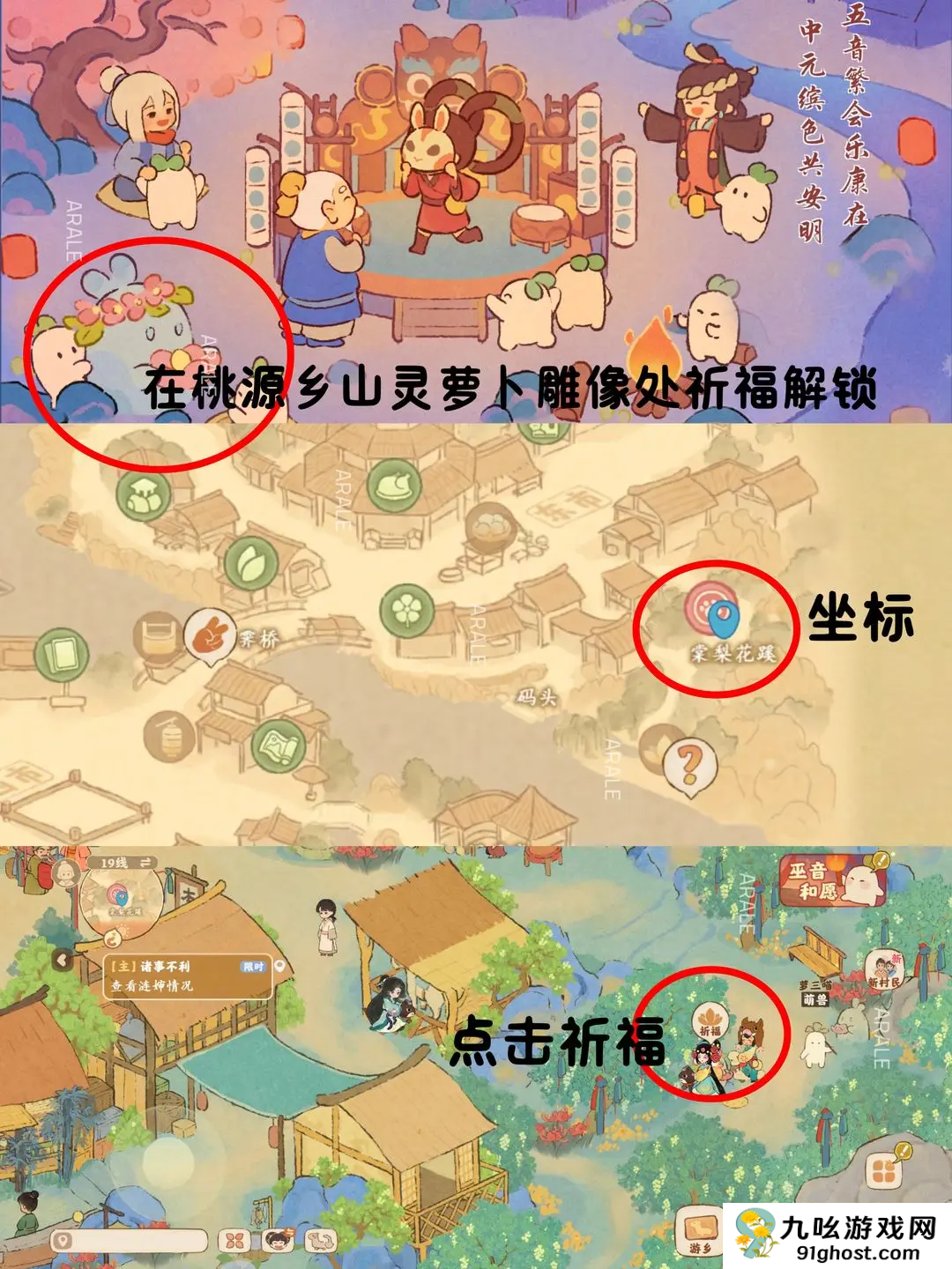 桃源深处有人家祈如愿活动需要做五个任务才可解锁奖励,五个任务分别需要在桃源乡与主舞台合影留念、在桃源乡完成限时剧情、在桃源乡面具摊附近的篝火处围坐看火光、在桃源乡萝三喵附近的山灵萝卜雕像处祈福。下文是具体的各个任务完成的具体位置详情!