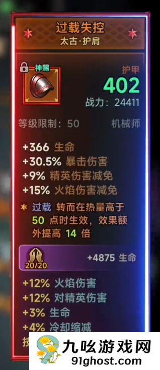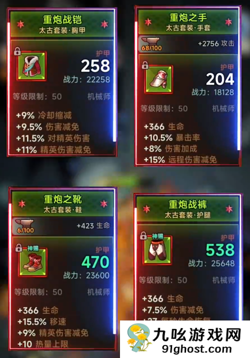 1、套装选择重炮四件套的重炮战铠、重炮之手、重炮之靴、重炮战裤