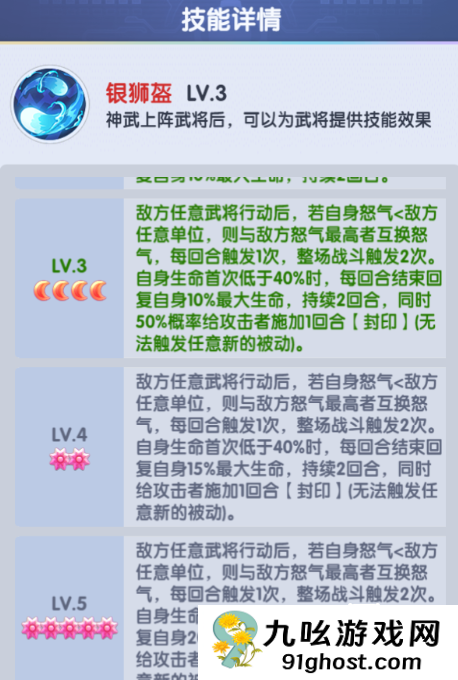 另一核心BUG级效果:当穿戴武将血量过半时,对攻击者施加1~2回合封印,使天赋、芯片、神武等失效(银狮盔自身也可能失效)。此机制常在高战力对决中逆转战局,导致越战翻盘,但也可能劝退追求稳定优势的玩家。
