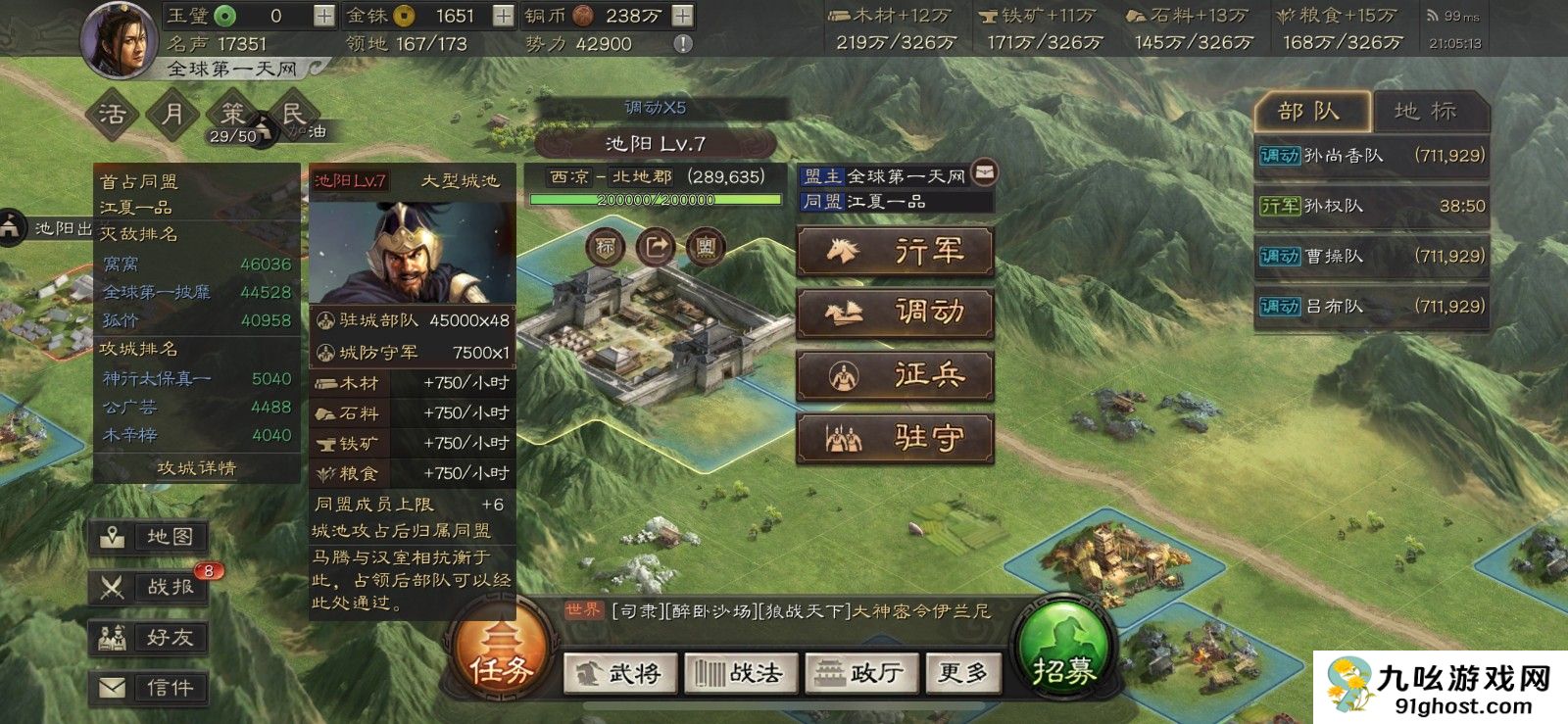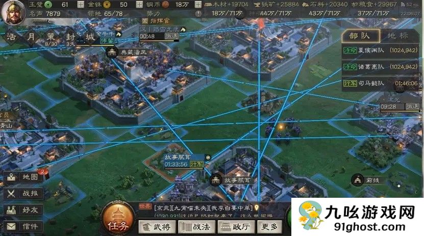 部队每移动一格降低1点士气,停留每分钟恢复0.5点。低士气会显著降低战斗伤害,因此长途行军前建议通过要塞或盟友领地调动,避免直接长距离移动。九宫格、八卦阵等守备建筑虽能增强主城防御,但对行军速度无加成,需区分优先级。