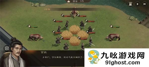 核心策略:开局触发百姓剧情后,立即抢占粮草恢复兵力。首回合采取上下夹击战术,精准锁定目标。
