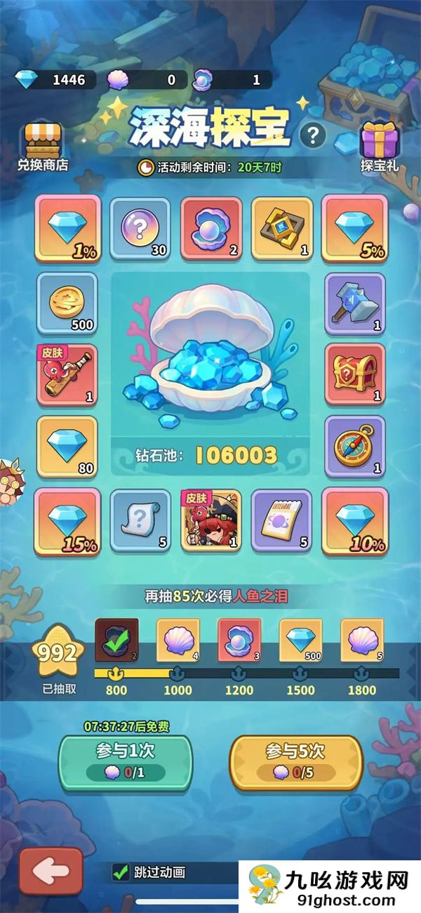 微氪玩家推荐全购深海探宝礼包(获250抽),搭配免费100抽,保底可得双皮肤。抽奖过程还将返还钻石、抽奖券等资源(约40%返利),性价比极高。